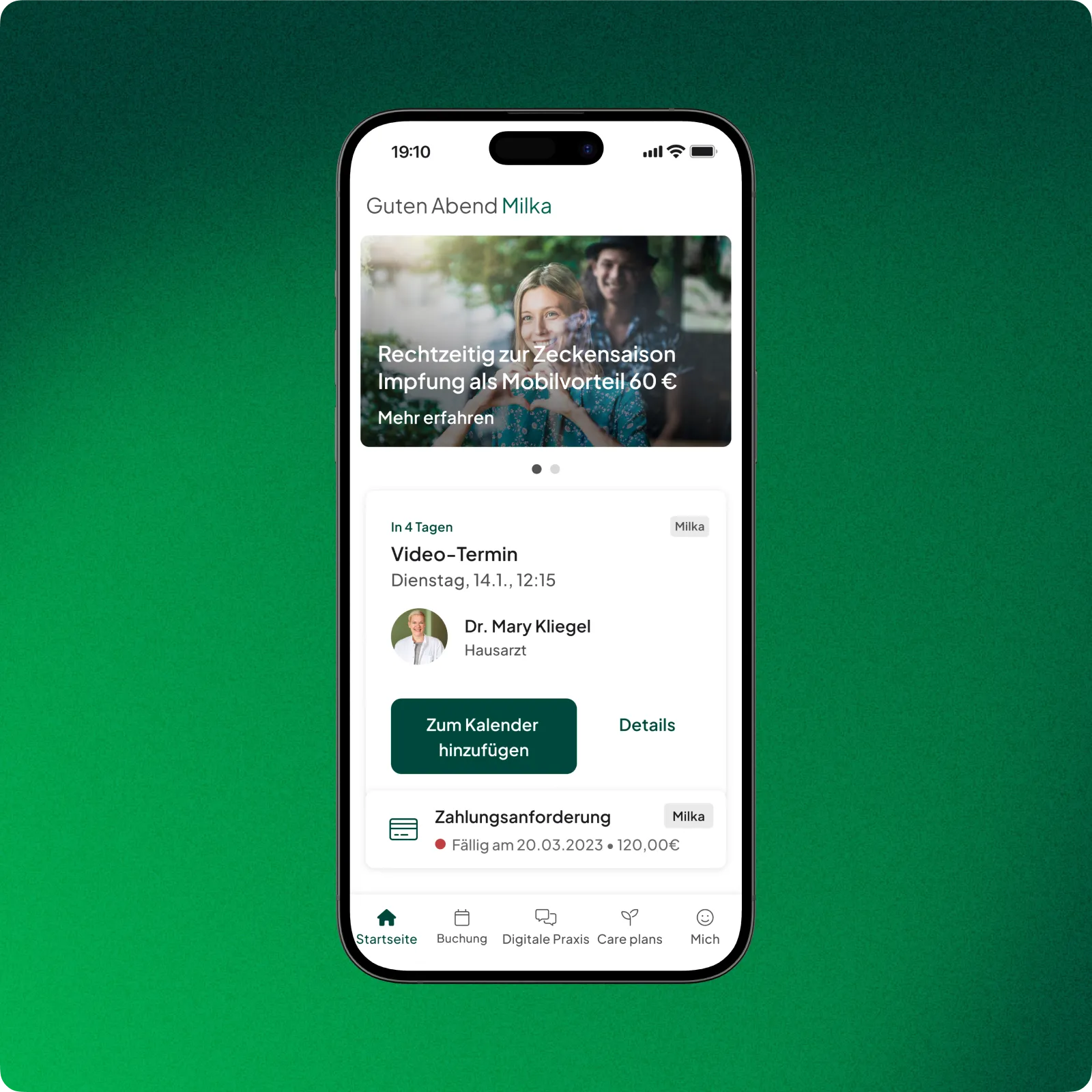 Konfigurieren und personalisieren Sie die Startansicht der Patient:innen mit Marketing-Bannern, Schnellzugriffen und Verknüpfungen zu externen Diensten.